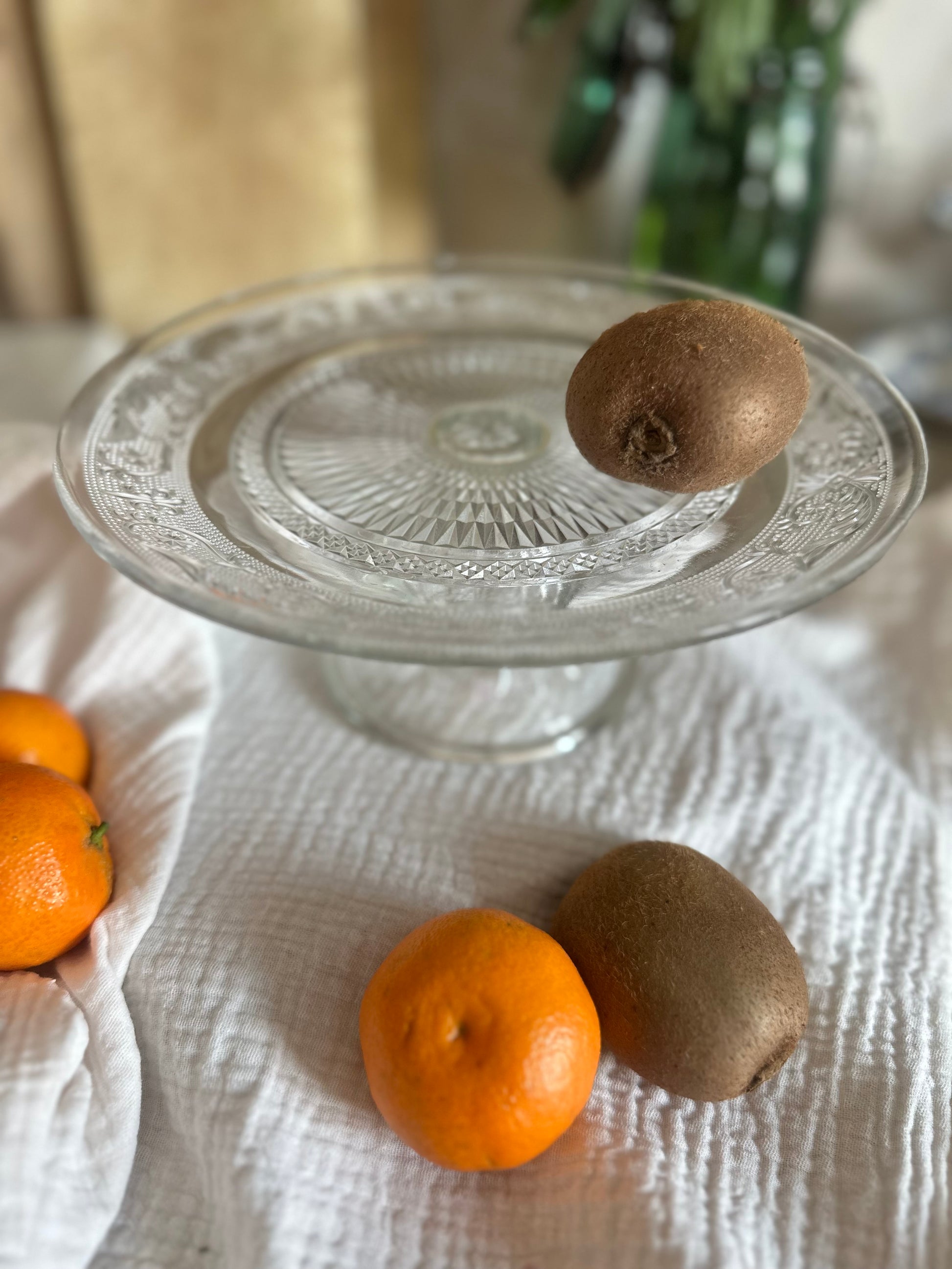 Un très joli plat sur pied en verre moulé. Il sera parfait pour accueillir vos fruits, apéros, ou petits gâteaux.